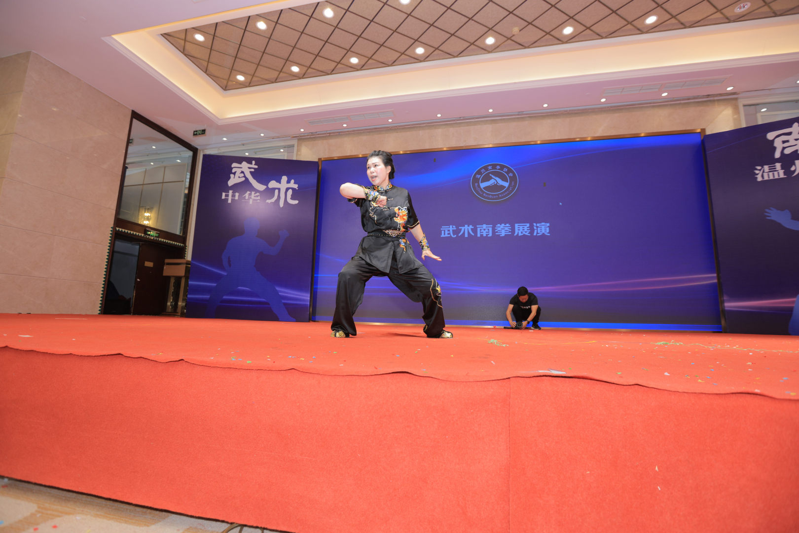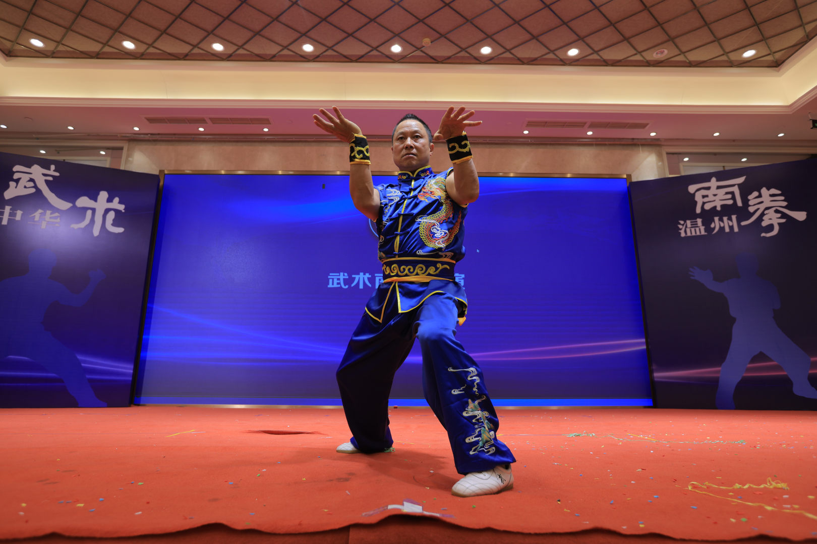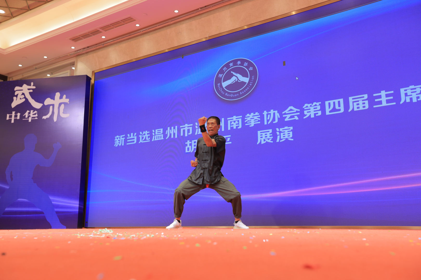 换届大会后,温州南拳协会新当选的主席、副主席和特邀副主席逐个上台展演刚柔拳、虎鹤拳、五基拳、扣步罗汉拳、丈二棒等40多个南拳套路,挺宇集团武术队展演集体罗汉排打功,把本次展演活动推向高潮。