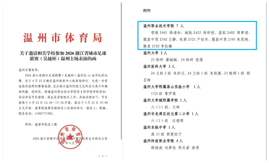 温州市体育局及赛事组委会相关负责人现场观看表演后,对同学们的专业表现给予高度评价,认为本次演出既展现了当代大学生昂扬向上的精神面貌,也生动传递了温州的城市活力与人文风采,是高校参与地方公共文体服务的优秀范例。